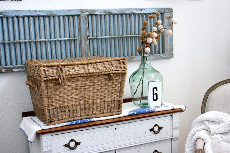 I like to take flowers out of my vases and added fall colored poms, switch out the art above dressers, and even add wheat, wreaths, baskets and signs. Each of these small touches are easy and quick and add that natural element that works perfectly for Fall.