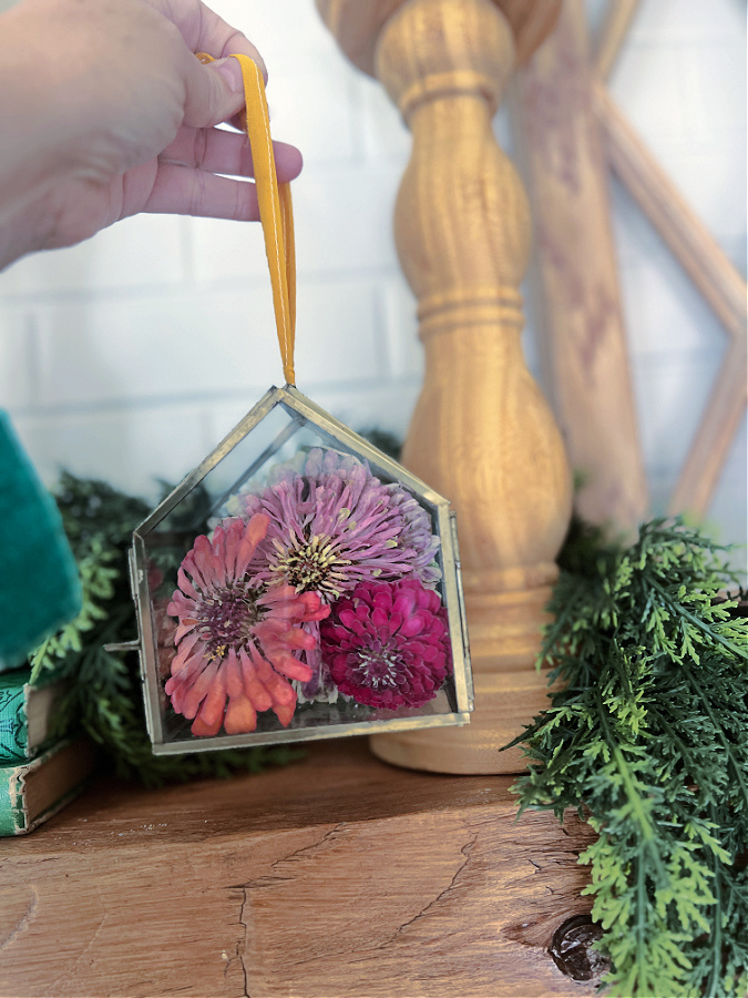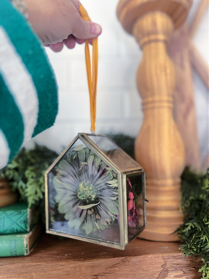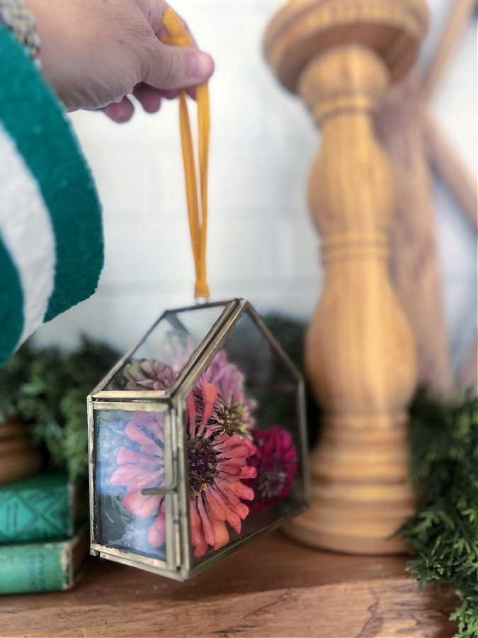 The ornament that completely stole my heart is Terrain’s fillable mini greenhouse ornament — it’s delicate, timeless, and the perfect size to hold a few of my preserved zinnias. I tucked in a handful of the dried blooms I saved from my summer garden, and it instantly became a meaningful keepsake — a little piece of summer that will shine on my Christmas tree all season long.