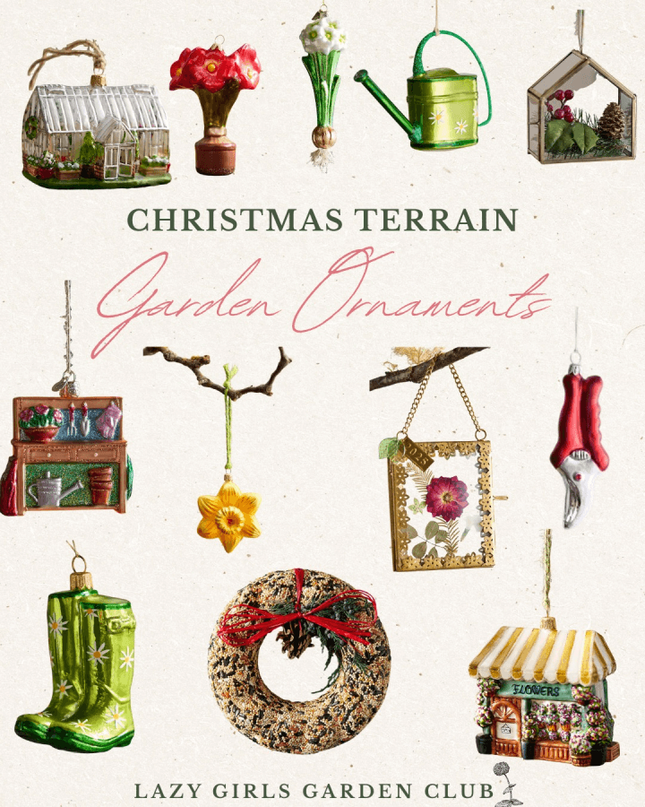 If you’ve been around here for a while, you know I love finding ways to sneak a little garden magic into every season — and Christmas is no exception! This year, while browsing Terrain’s holiday collection, I fell head over heels for their garden-themed Christmas ornaments. From tiny watering cans and glass terrariums to botanical-inspired baubles, each one feels like it was made for gardeners like us.